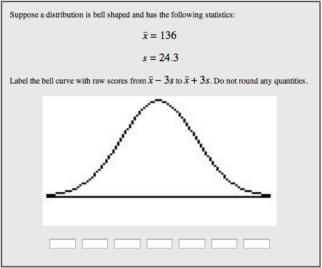 Description: A WeBWorK problem that asks students to label raw scores +/- 3 standard deviations from the mean of a bell-shaped distribution. The mean and standard deviation are randomly generated so each student has a unique problem.