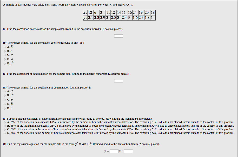 Description: A WeBWorK problem that asks questions about the correlation between two sets of data values. The data sets are randomly generated so each student has a unique problem.