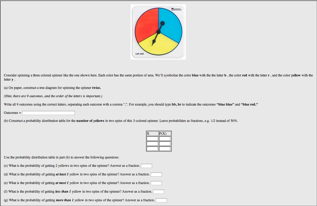 Description: A WeBWorK problem that asks students construct a probability distribution and answer questions on it.