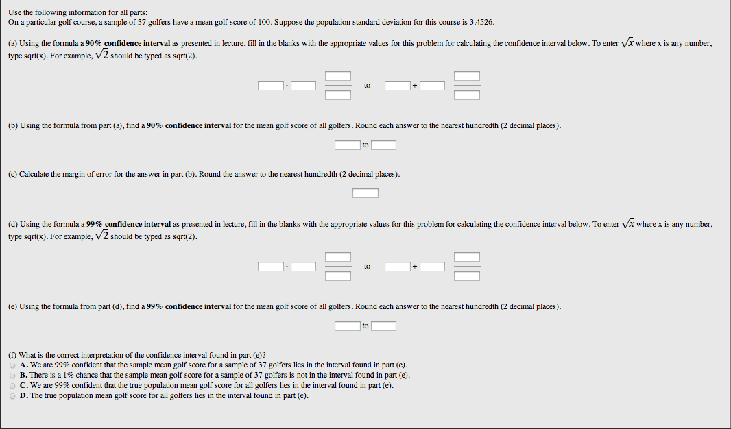 Description: A WeBWorK problem that asks students to construct a confidence interval given a population standard deviation and answer questions on it. The mean, standard deviation, and sample size are randomly generated so each student has a unique problem.
