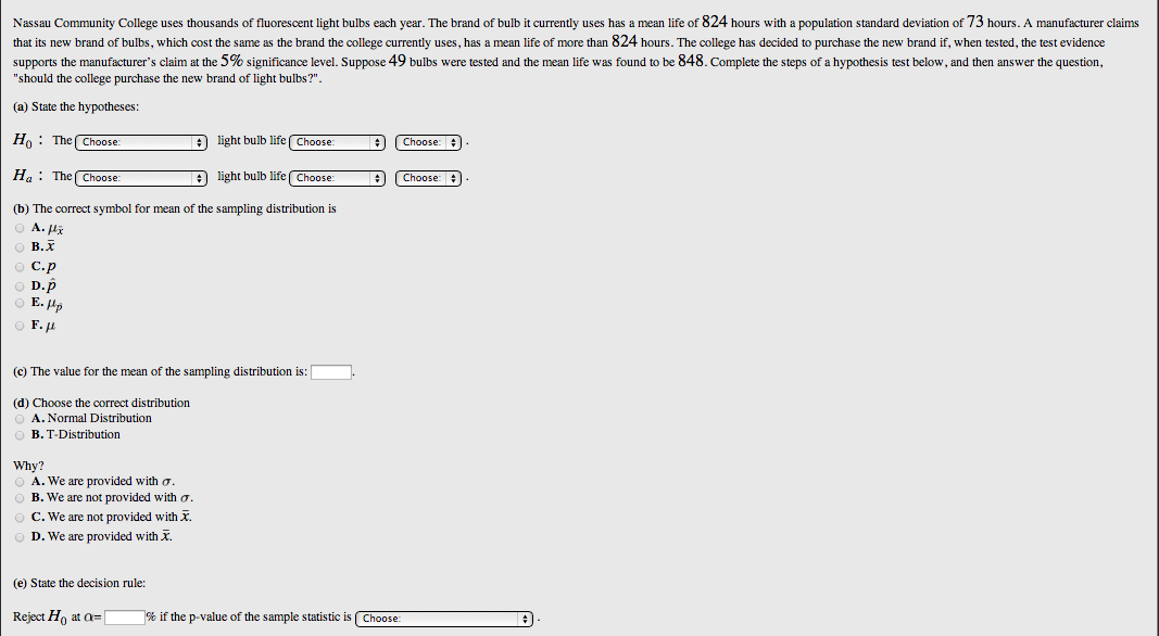 Description: A WeBWorK problem that asks students to conduct a hypothesis test with a known population standard deviation. The p-value approach is used. The sample mean, population mean, standard deviation, and sample size are randomly generated so each student has a unique problem.