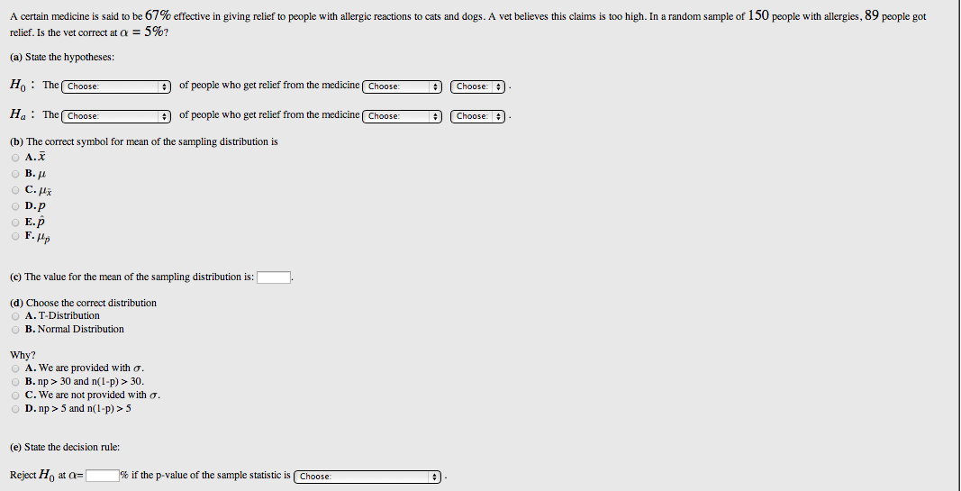 Description: A WeBWorK problem that asks students to conduct a hypothesis test involving proportions. The p-value approach is used. The population proportion, sample proportion and sample size are randomly generated so each student has a unique problem.